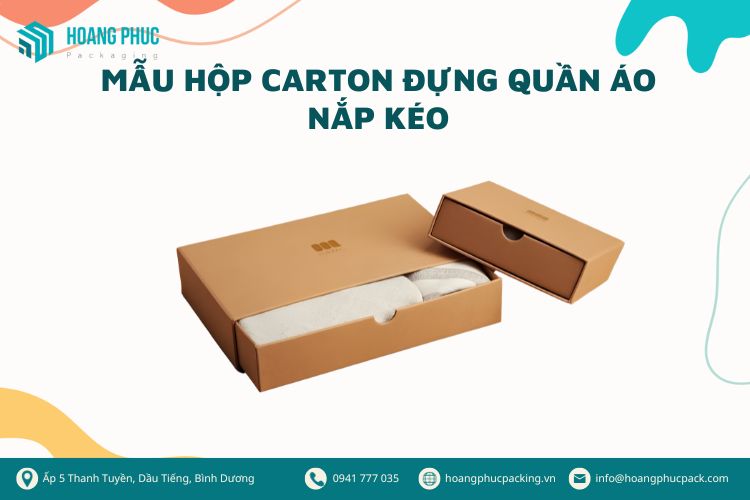 Hộp carton nắp kéo đựng quần áo cũng là thiết kế sang trọng, ấn tượng. Nó khiến cho sản phẩm toát lên vẻ cao cấp, cho dù hộp được in ấn khá đơn giản.