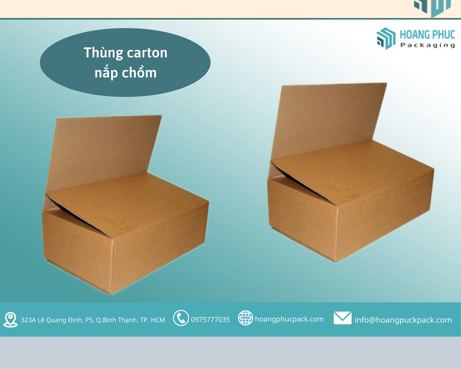 Thùng carton nắp chồm (nắp chồng) có thiết kế gần giống thùng thường, tuy nhiên 2 cánh gấp chính lớn và chồng lên nhau. Tuy thùng nắm chồm không phổ biến như những loại thùng khác, nhưng vẫn được sử dụng cho những sản phẩm cần tính bảo vệ bề mặt cao như gỗ nội thất, kệ ti vi, tủ, ghế,...