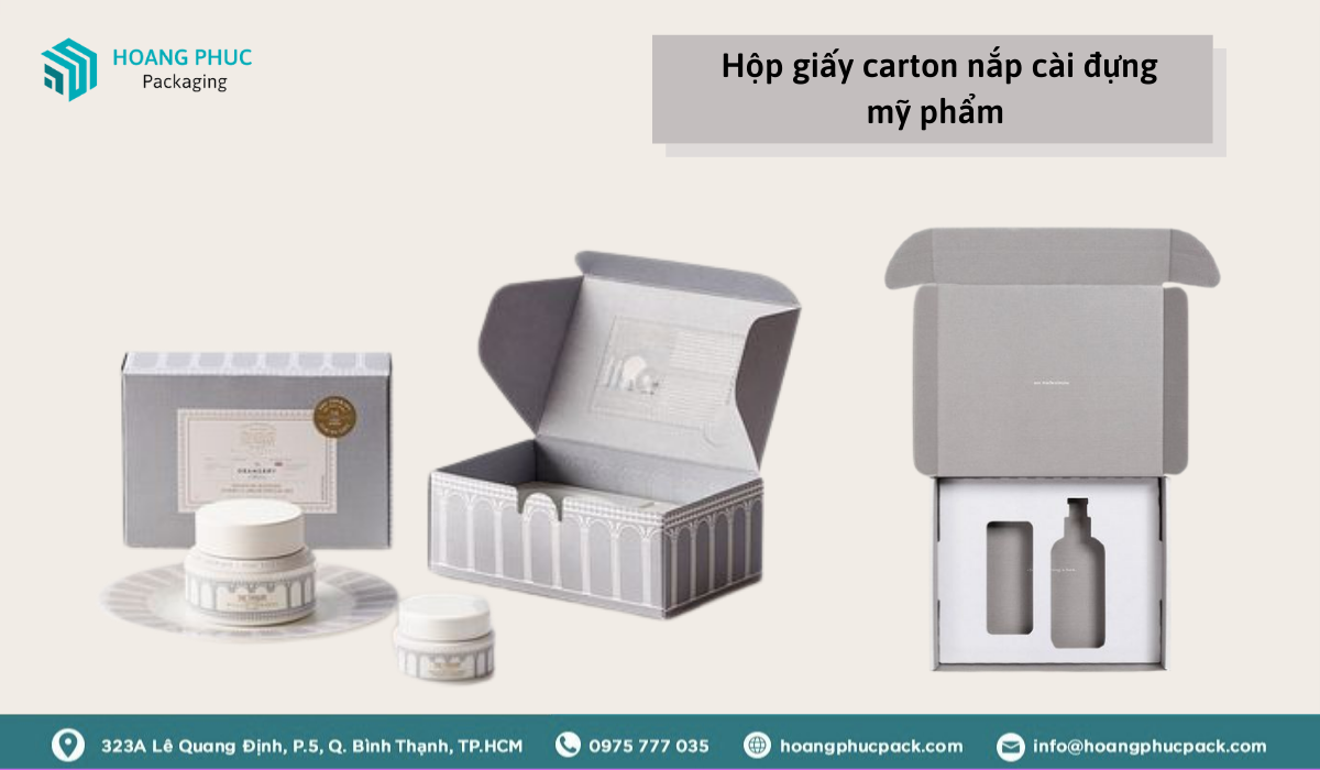 Hộp carton nắp cài là sản phẩm được sử dụng nhiều nhất trên thị trường nhờ tính ứng dụng cao ở hầu khắp các ngành hàng. Đối với ngành mỹ phẩm cũng không ngoại lệ. Hộp carton nắp cài dễ mua và có đầy đủ các kích thước cho doanh nghiệp chọn lựa. Với hộp carton nắp cài, các doanh nghiệp có thể đựng được rất nhiều sản phẩm trong khi vận chuyển. Tuy nhiên, một điều cần lưu ý khi sử dụng hộp carton nắp cài đó là các bạn cần phải sử dụng thêm một số miếng xốp hoặc bong bóng khí trước khi vận chuyển.