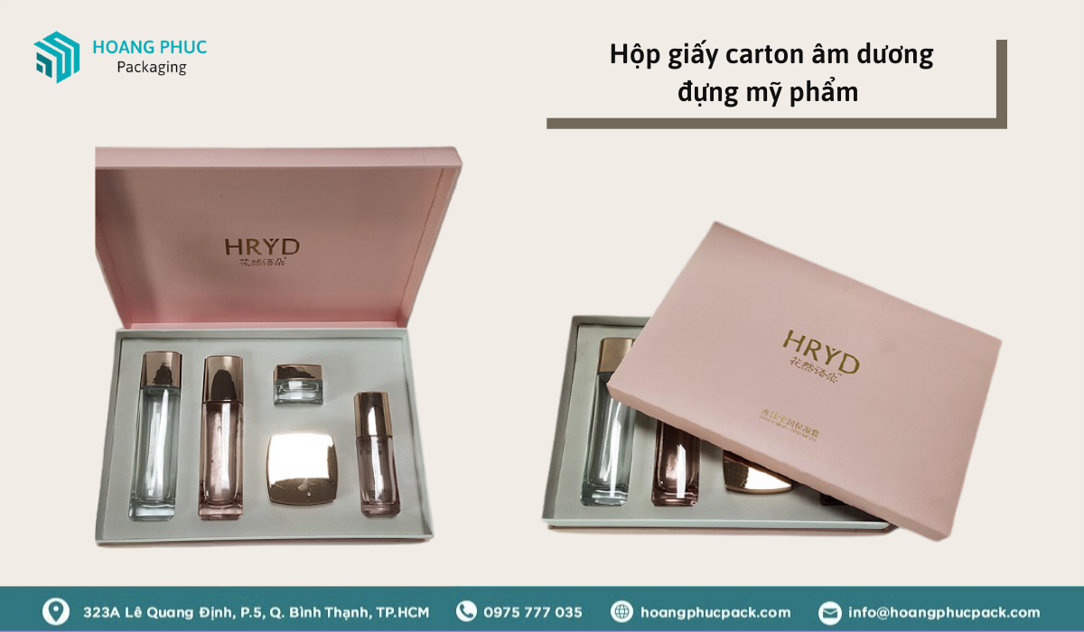 Chính vì sự độc đáo và sang trọng nên dễ dàng được lựa chọn làm hộp mỹ phẩm cao cấp để làm quà tặng. Cấu tạo đơn giản gồm hai phần, phần âm và phần dương. Phần âm là thùng chứa, và phần dương là nắp.Hộp giấy mỹ phẩm kiểu dáng âm dương mang thiết kế đẹp mắt, dễ sử dụng và kín đáo. Do đó, nó có thể bảo vệ sản phẩm khỏi nhiệt, ánh sáng, độ ẩm, …