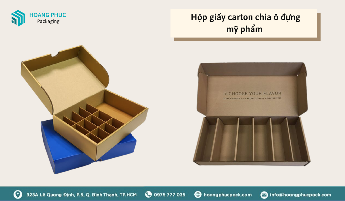 Với mỹ phẩm những sản phẩm đóng chai thủy tinh thì hộp carton chia ô là sự lựa chọn tốt nhất để vận chuyển. Bởi những ô chia này thường được thiết kế vừa với khuôn chai. Nhờ đó giúp cố định chúng đảm bảo không bị vỡ trong quá trình vận chuyển.