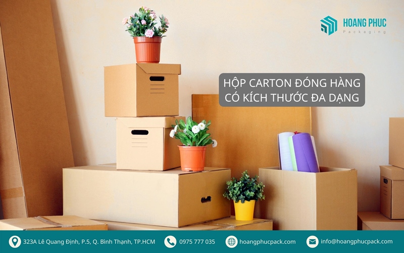 Hộp đa dạng kích thước: Kích thước đa dạng để phù hợp với nhiều loại hàng hóa. Hộp carton có thể có kích thước rất lớn, đôi khi cũng có những chiếc hộp kích thước mini tùy vào từng loại hàng hóa sản phẩm. Khách hàng có thể chủ động lựa chọn hộp có kích thước sẵn có hoặc đặt hàng theo kích thước mong muốn.