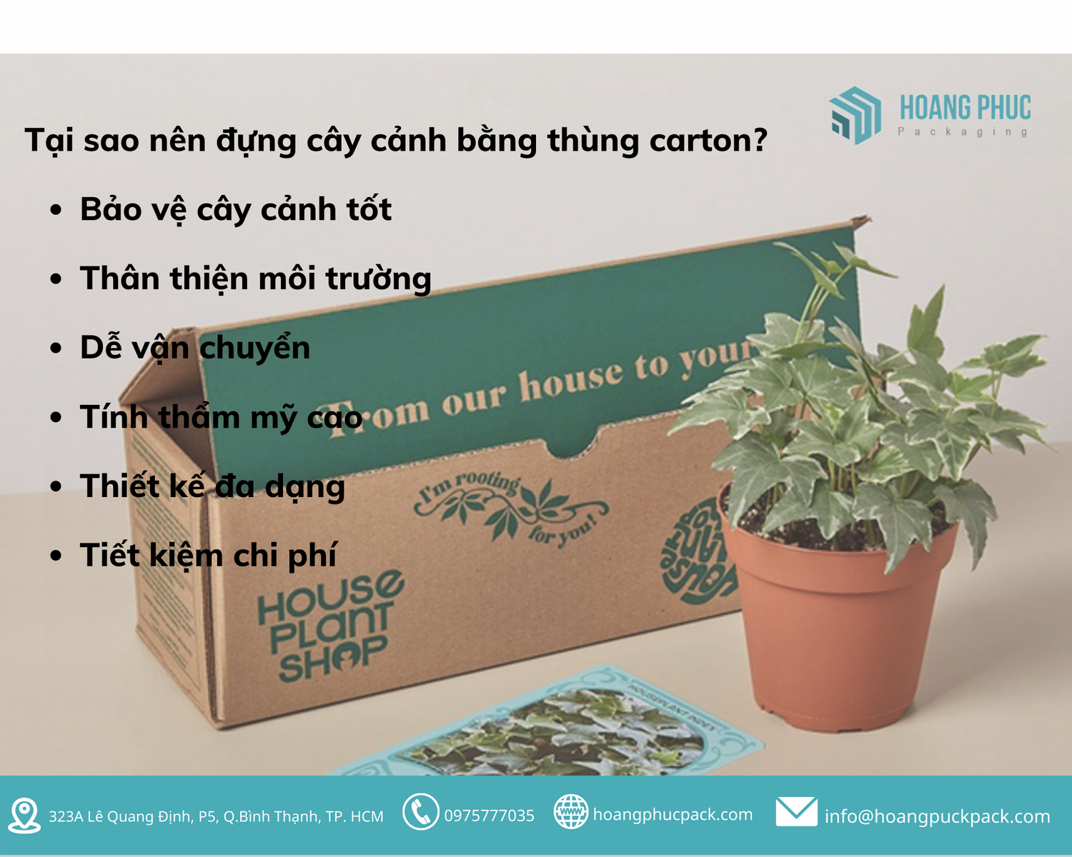 Cây cảnh xuất hiện khắp mọi nơi trong đời sống của chúng ta. Chúng mang lại rất nhiều lợi ích vô cùng lớn cho con người mà chúng ta không thể phủ nhận được. Nên nhiều gia đình đã lựa chọn cây cảnh là thú vui để chăm sóc, vừa giải toả căng thẳng sau những ngày làm việc, vừa đem lại không khí trong xanh cho căn nhà của mình.Nhưng cây cảnh lại có rất nhiều kích thước và cân nặng khác nhau. Bạn có thể sẽ gặp khó khăn trong việc vận chuyển chúng. Vậy thì làm sao để vận chuyển cây cảnh an toàn, không bị gãy cành dập nát? Thùng carton đựng cây cảnh là một gải pháp tốt cho vấn đề này. Hãy để Hoàng Phúc Pack giải thích cho bạn lý do tại sao nhé.