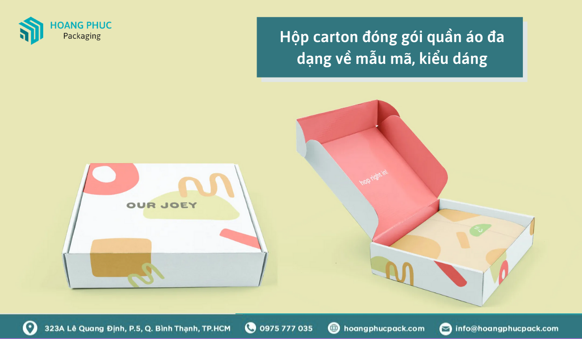 Khác với sản phẩm hộp carton thông thường, kiểu dáng, kích thước hộp carton ngành may mặc rất đa dạng, phong phú và phù hợp với yêu cầu của doanh nghiệp. Các doanh nghiệp có thể tự lên ý tưởng và thiết kế bao bì sản phẩm sao cho phù hợp với sản phẩm và doanh nghiệp của mình.