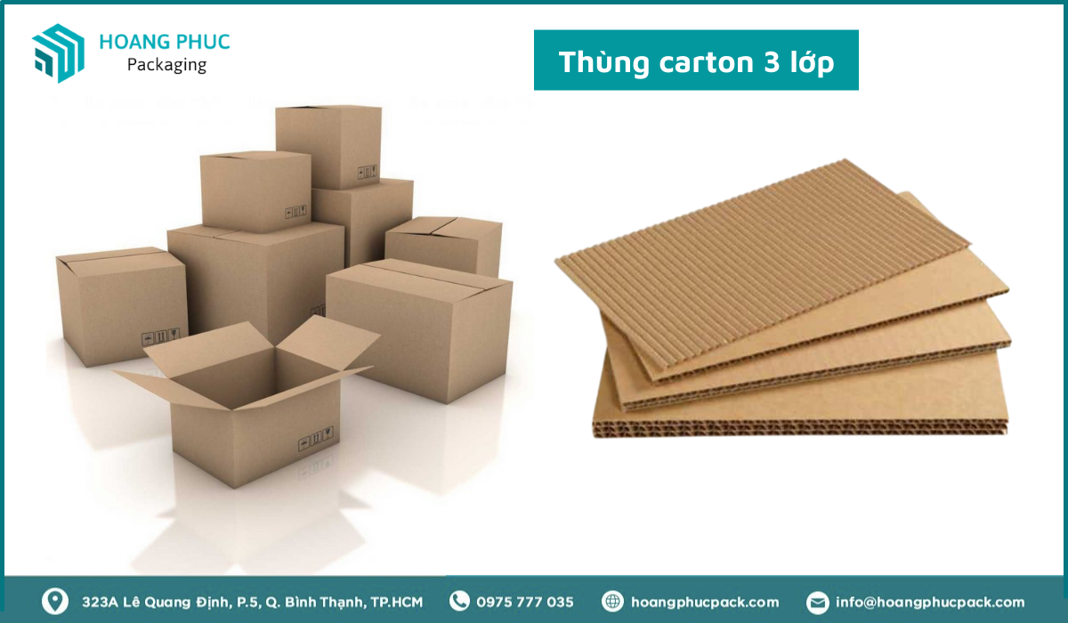 Thùng carton 3 lớp: Là loại thùng carton rất phổ biến, chiếm 90% số thùng carton được sử dụng trên thị trường ngày này. Thùng gồm 3 lớp giấy carton: 2 lớp giấy carton ngoài và 1 lớp sóng ở giữa dạng hình sin.