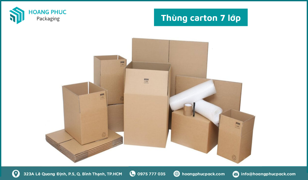 Thùng carton 7 lớp: Thùng carton 7 lớp là thùng carton cấu tạo từ 7 lớp giấy carton bao gồm 2 lớp ngoài, 2 lớp trong và 3 lớp sóng giấy hình sin