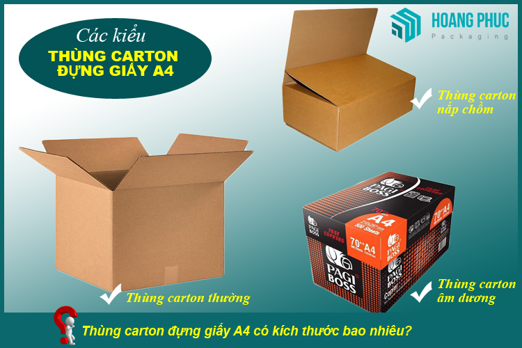 c) Có các kiểu thùng carton đựng giấy A4 nào?