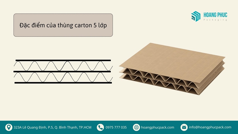 Thùng carton 5 lớp được cấu tại từ 5 tấm giấy (5 lớp). Trong đó có 3 lớp giấy thường và 1 lớp hình sin (hình sóng). Các lớp giấy khác nhau được xếp xen kẽ đảm bảo 2 lớp ngoài cùng là giấy thường.